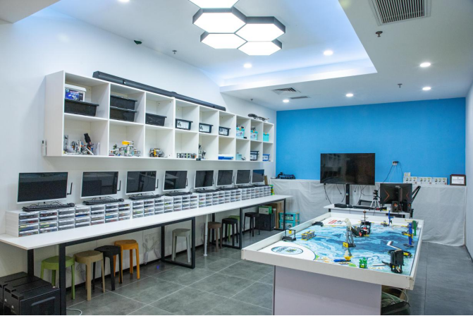 走进新智力的教室,第一感觉就是“安静”。没有那种挤得满满当当的共用工位,每个娃都有自己的专属小工位,工具、零件、设备一人一份,不用抢,不用等。上次去的时候,一个8岁的娃正在搭机器人,用完的零件随手就放回自己的收纳盒里,动作熟门熟路。 老师说,这种工作室布局就是为了让娃能专注,不用被别人打扰。现代化的装修,全新的科创设备,娃坐在自己的工位上,能安安静静打磨自己的作品——毕竟,搞创作这种事,最需要的就是能沉下心的环境。